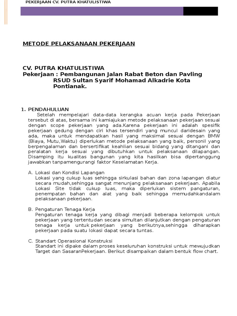 Contoh metode pelaksanaan pekerjaan jalan. Lingkup pekerjaan pekerjaan ini mencakup semua kegiatan mobilisasi peralatan dan personil yang di perlukan dan semua falitas pendukung selama dalam masa pelaksanaan pekerjaan serta melakukan demobilisasi kembali terhadap semua terhadap semua peralatan dan personil pada saat pekerjaan selesai. Untuk paket pekerjaan ini pemerintah menganggarkan dana dengan nilai hps sebesar rp 7165800000 tujuh milyar ser atus e nam puluh lima juta delapan ratus ribu rupiah dengan target panjang pekerjaan sepanjang 2700 m 27 km dengan jangka waktu pelaksanaan selama 1 8 0 seratus delapan puluh hari kalender dan jangka waktu pemeliharaan selama 360 tiga ratus enam puluh hari kalender. If you continue browsing the site you agree to the use of cookies on this website. Contoh metode pelaksanaan pekerjaan jalan. Oct 26 2017 rumus kebutuhan beton jalan. Bagi anda yang sedang mencari contoh metode pelaksanaan untuk item pekerjaan mobilisasi disini saya akan memberikan contoh metode tersebut kebetulan saya juga bekerja di sebuah perusahaan yang bergerak dibidang pekerjaan jalan yang juga bertugas sebagai pembuat penawaran proyek.
