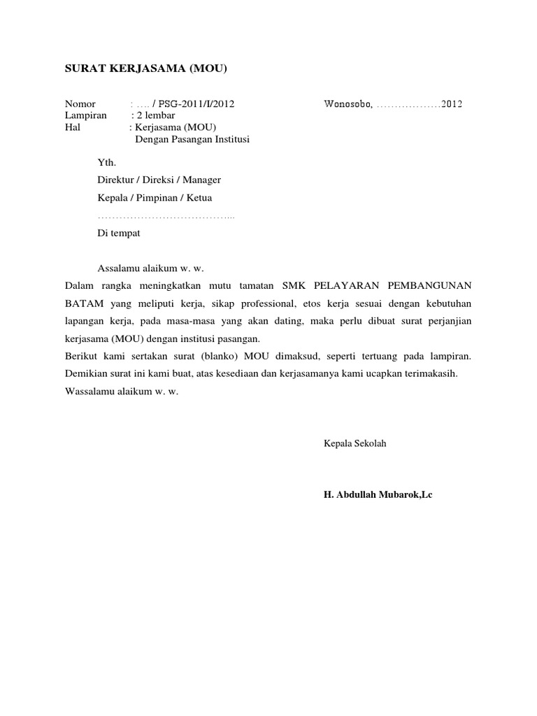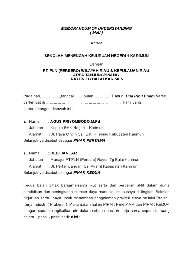 Dimana usaha yang dibutuhkan tergantung dari kebutuhan sekolah itu sendiri. 5 contoh mou kerjasama perusahaan perjanjian kerja perjanjian memang sangat diperlukan untuk mengetahui apa saja hal hal yang membatasi kedua belah pihak yang berjanji dan salah satu cara untuk mengetahui hal tersebut adalah dengan membuat contoh mou kerjasama karena di dalamnya akan menjelaskan apa saja poin poin kesepakatan yang dibuat. Mou dibuat dalam bentuk kontrak dan disertai dengan peraturan dan konsekuensi yang mengikat bagi kedua belah pihak yang terkait. Mou merupakan kesepakatan pendahuluan. Dalam rangka meningkatkan mutu pendidikan smk al hikmah mesuji yang meliputi kerja sikap professional etos kerja sesuai dengan kebutuhan lapangan kerja pada masa masa yang akan datang maka perlu dibuat surat perjanjian kerjasama mou dengan institusi pasangan. Pelaksanaannya diatur secara bertahap terencana terarah dan berkelanjutan sesuai dengan tuntutan perubahan kehidupan lokal nasional dan global.