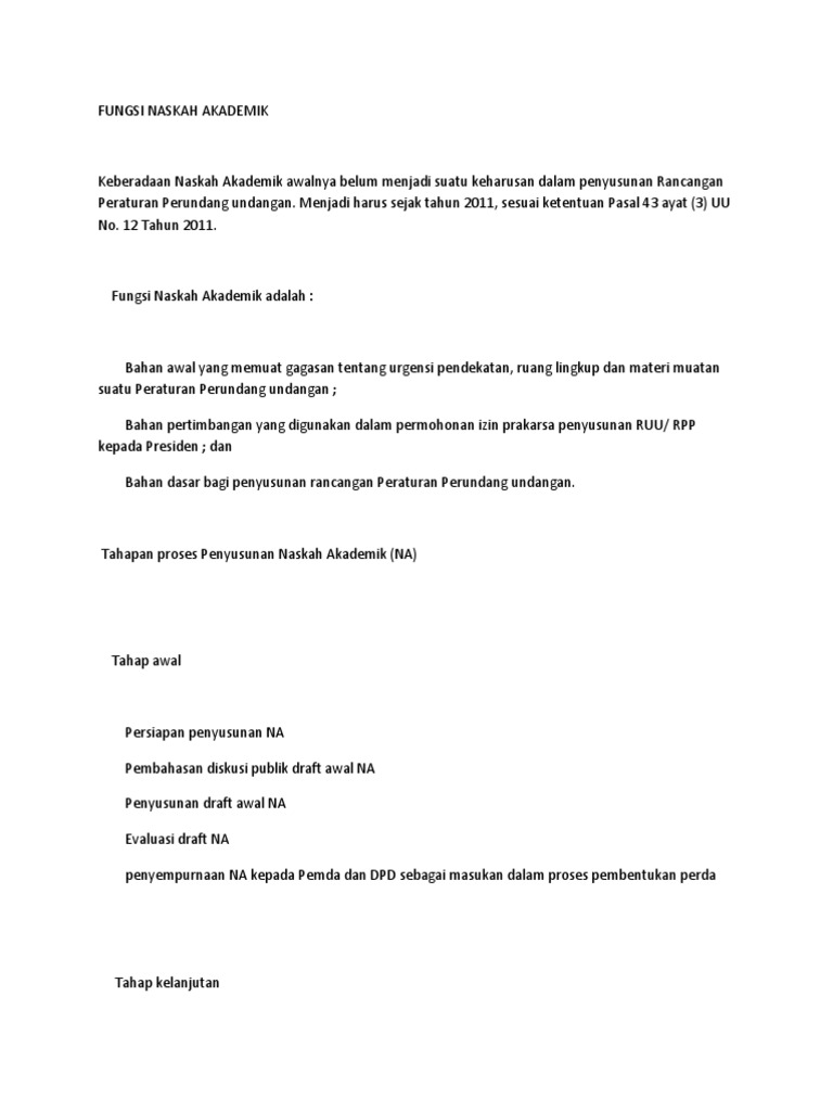 Naskah akademik pada akhirnya berfungsi mengarahkan ruang lingkup materi muatan rancangan undang undang. Nomor 12 tahun 2011. Naskah akademik sebagaimana tercantum dalam pasal 1 angka 11 undang undang nomor 12 tahun 2011 adalah hasil penelitian atau pengkajian hukum dan hasil penelitian lainnya terhadap suatu masalah tertentu yang dapat dipertanggungjawabkan secara ilmiah mengenai pengaturan masalah tersebut dalam suatu rancangan undang undang rancangan peraturan daerah provinsi atau rancangan peraturan daerah. Penyusunan naskah akademik ini didasarkan pada hasil kajian dan diskusi terhadap substansi materi muatan yang terdapat di dalam undang undang nomor 12 tahun 2011 tentang pembentukan peraturan perundang undangan terutama kelemahannya yang terkait. Undang undang nomor 12 tahun 2011 tentang pembentukan peraturan perundang undangan merupakan pelaksanaan dari perintah pasal 22a undang undang dasar negara republik indonesia tahun 1945 yang menyatakan bahwa ketentuan lebih lanjut mengenai tata cara pembentukan undang undang diatur lebih lanjut dengan undang undang namun ruang lingkup materi muatan undang undang ini diperluas tidak.