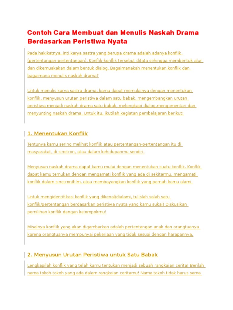 Sementara waktu untuk subalur subplot dan adegan yang tidak melibatkan karakter utama kisahnya hanya sedikit. Leli adalah sosok remaja yang hidup dengan kadar ekonomi yang kurang baik. Dalam pementasan drama kita akan dikenalkan beberapa tokoh yang diperankan entah itu tokoh antagonis ataupun protagonis. Pengembangan naskah drama dari cerita di atas adalah berikut. Contoh drama mungkin sebagian dari anda pernah melakukan drama ataupun pernah menonton pementasan drama. Berikut adalah contoh dari drama satu babak.