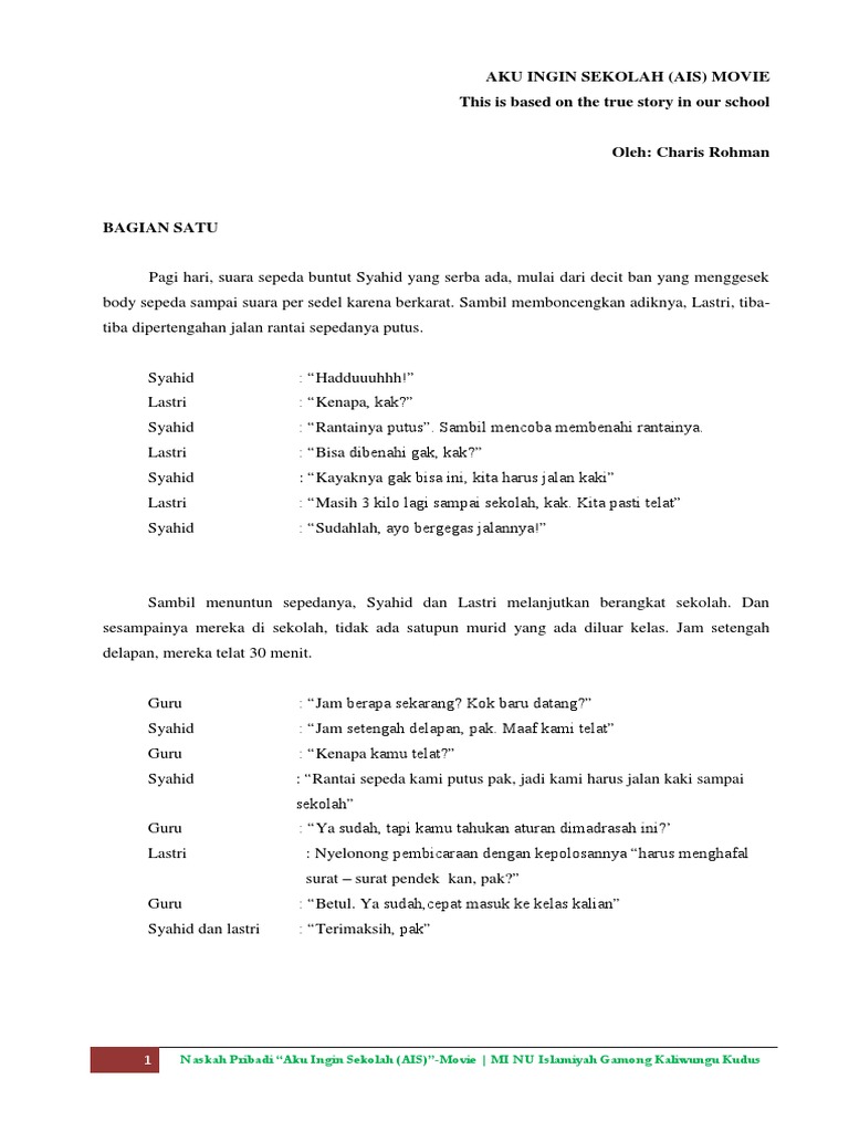Contoh naskah film pendek sekolah. Sekolah ini meberikan pelayanan secara geratis bagi siswanya. 14 contoh naskah drama. Jika pembaca ingin mengetahui beberapa jenis drama pembaca bisa membuka artikel jenis jenis drama dan juga jenis jenis drama berdasarkan wujud pementasan. Adapun dalam proses pembuatan film maka memang harus dibuat terlebih dahulu skenarionya jadi bisa dikatakan skenario ini di buat pra produksi sebuah film. Bagi seorang sutradara membuat naskah film pendek ini sangat sulit. Demikianlah contoh naskah drama anak sekolah dalam bahasa indonesia.