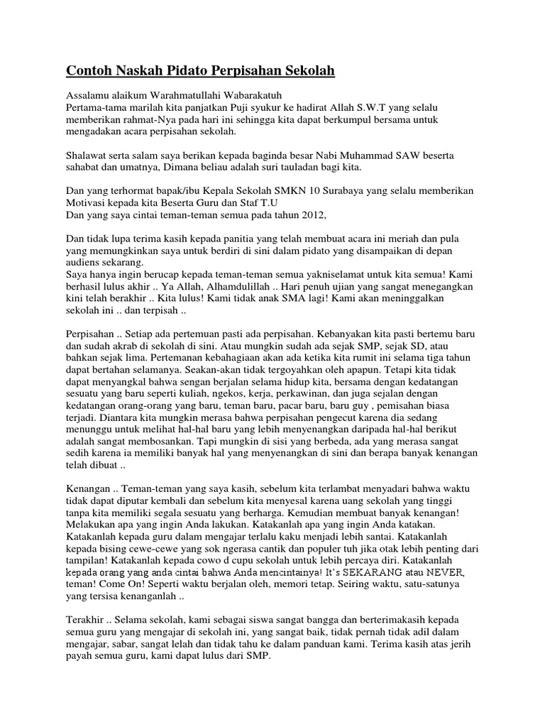 Contoh naskah pidato perpisahan. Dan teman teman kelas 12 angkatan 2009 khususnya teman teman 12 ipa 3 yang teramat saya cintai. Contoh pidato perpisahan kelas 6 perpisahan merupakan salah satu momen dan suasana dimana orang akan berpisah untuk waktu yang lama. Pengertian kedua mengacu pada bentuk bahasa tulisnaskah. Contoh pidato singkat tentang lingkungan pendidikan kesehatan kebersihan narkoba islami perpisahan kelas 6 9 12 yang menarik lucu menghibur. Kepada yang terhormat bapak dan ibu guru sma n 1 cilegon. Masalahnya tidak semua orang pandai menyusun pidato perpisahan.
