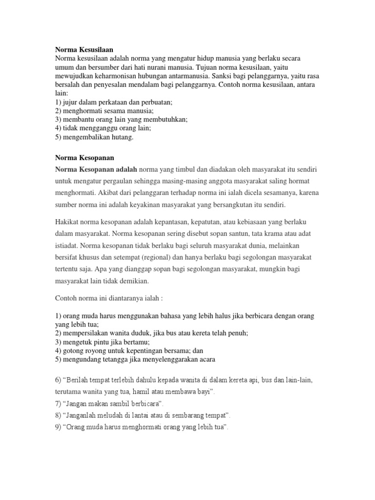 Contoh nilai dan norma. Contoh norma nilai nilai aturan pada masyarakat sasak di lombok tentu hanya berlaku bagi masyarakat sasak. Meminta ijin kepada orang tua saat hendak bepergian jauh. Nilai benda kayu jati dianggap tinggi sehingga kayu jati memiliki nilai jual lebih mahal daripada kayu kamper atau kayu lainnya. Mencium tangan kedua orang tua saat hendak keluar rumah. Tidak boleh membunuh sesama manusia. Untuk menjelaskan secara lengkap terkait dengan peran nilai dan norma sosial dalam suatu kasus berikut inilah dijabarkan contoh contoh kejadiannya.