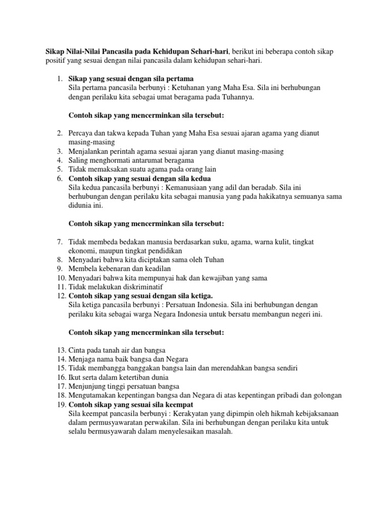 Contoh nilai nilai pancasila. Pengertian sejarah ciri karakteristik dan contoh adalah pancasila merupakan suatu sistem nilai yang di jadikan sebagai dasar filsafat negara republik indonesia yang resmi di sahkan oleh ppki pada tanggal 18 agustus 1945. Keputusan musyawarah secara bertanggung jawab merupakan nilai pancasila dan dpt di terapkan dalam keluarga penerapan nilai pancasila dalam keluarga yg tepat di antarany mampu. Inilah contoh sikap berdasarkan sila sila di pancasila ditulis oleh life is te way pada minggu. Nilai ketuhanan yang maha esa mengandung arti adanya pengakuan dan keyakinan bangsa terhadap adanya tuhan sebagai pencipta alam semesta. Jadi sila kedua pancasila pada hakikatnya bukan hanya sekadar menyoal hubungan manusia dengan manusia lainnya melainkan juga hubungan manusia dengan alam sekitar. Segala keputusan tindakan dan perilaku pemerintah sebagai penyelenggara negara harus selaras dengan nilai nilai pancasila.