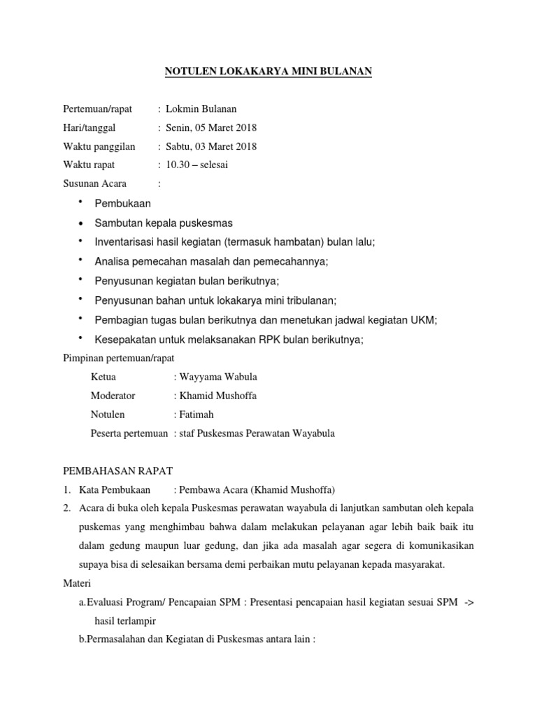 Doc notulen lokmin puskesmas tanggulangin academiaedu. Berbicara mengenai lokmin bulanan puskesmas kami telah membagikan informasinya melalui tulisan kami sebelumnya yang berjudul pedoman lokakarya mini puskesmas.