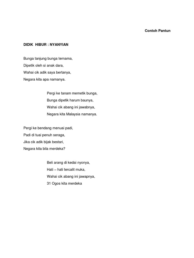 Kategori sastra navigasi tulisan. 17 contoh pantun anak anak beserta maknanya akan diuraikan secara lengkap pada materi pelajaran bahasa indonesia sebagai berikut ini. Pantun ini juga tersedia untuk semua kalangan seperti anak anakremaja dan bahkan dewasa. Dengar lagu berirama tersenyumlahlah si adik manja mari main bersama sama jangan duduk sendiri saja. Satu pemikiran pada kumpulan contoh pantun anak anak bersuka cita fatimah syahrini. Ada juga beberapa variasi dari jenis pantun misalnya pantun yang hanya terdiri dari dua baris saja bahkan ada juga pantun tang terdiri lebih dari 4 baris.