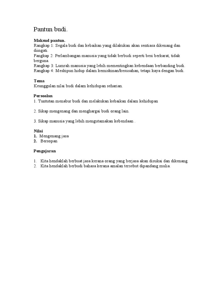 Pengertian budi pekerti tujuan macam dan contoh budi pekerti terlengkap secara etimologi budi pekerti berasal dari bahasa jawa yaitu budi yang berarti pikir dan pakerti yang berarti perbuatan. Karna budi pekerti adalah simbol pendidikan yang di artikan sebagai prilaku serta ahlak yang baik yang harus di miliki setiap orang. Pantun budi adalah pantun yang berisi tentang ajaran budi pekerti dan perilaku luhur dalam kehidupan bermasyarakat. Pantun budi pekerti menjadi seorang pribadi yang memiliki akhlak yang mulia itu wajib harus kita laksanakandi setiap agama yang kita anut masing masing pasti mengajarkan harus menjadi manusia yang bermanfaat dan juga memiliki budi pekerti yang baik. Mendapat rusa belang di kaki rusa memakan daun suji hendaknya engkau memiliki segenap akhlak yang terpuji. Pantun pendidikan merangkai budi pekerti.