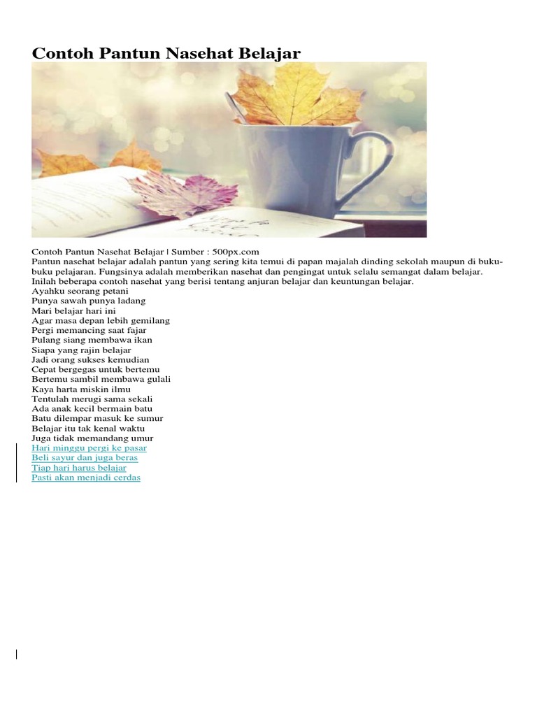 Contoh pantun nasehat pantun adalah salah satu jenis karya puisi lama dengan 4 baris dan sajak a b a b di akhir larik baris pertama dan baris kedua berupa sampiran sedangkan baris ketiga dan keempat merupakan isikali ini akan dibagikan contoh contoh pantun nasehat dan maknanya. 105 contoh pantun nasehat belajar pendidikan orang tua agama anak adab maknanya untuk pembahasan kali ini kami akan mengulas mengenai pantun nasehat yang dimana dalam hal ini meliputi belajar pendidikan orang tua agama anak adab dan maknanya untuk lebih memahami dan mengerti simak ulasan dibawah ini. Kumpulan koleksi contoh pantun nasehat orang tua anak anak belajar pendidikan agama pantun nasehat orang tua adalah pantun yang isinya merupakan nasehat nasehat atau wejangan dari orang tua yang biasanya ditujukan untuk anak anaknya. Pengertian jenis ciri ciri dan contoh pantun semua orang suka pantun. Baik pantun jenaka pantun nasehat pantun cinta pantun lucu pantun agama atau pantun teka teki semuanya disukai oleh orang. Pantun nasehat yang berisi anjuran dan mendidik juga sering digunakan di dunia pendidikan.