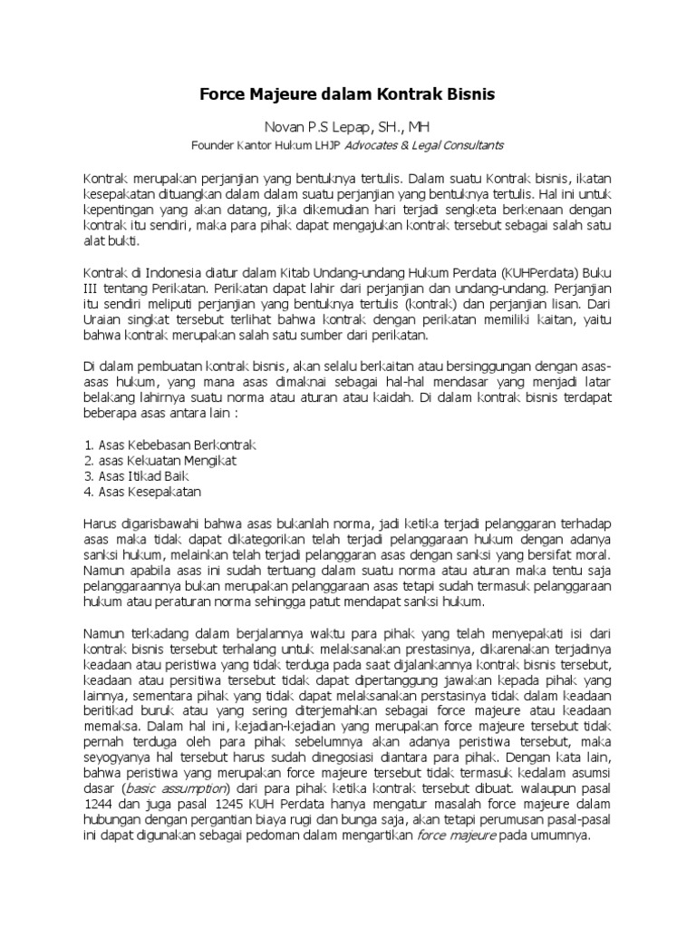 Contoh pasal force majeure dalam perjanjian. Berbeda dengan wanprestasi tidak terlaksananya atau terlambatnya pelaksanaan kewajiban dalam force majeure terjadi bukan karena kelalaian melainkan suatu keadaan atau peristiwa yang berada di luar kendali para pihak. Private law in civil law system is generally contains two major sections. Secara umum sejumlah peristiwa dapat digolongkan ke dalam force majeure selama mereka terjadi tanpa terduga terjadi di luar kuasa pihak pihak yang terkait dan tidak dapat dihindari. Yang dimaksud dengan keadaan memaksa force majeure adalah keadaan atau peristiwa yang terjadi di luar dugaan kemampuan dan kekuasaan para pihak yang mengakibatkan terhambatnya pelaksanaan kewajiban salah satu atau para pihak sesuai dengan ketentuan perjanjian ini yaitu. Pihak pertama dibebaskan dari segel ganti rugi atau tuntutan dari pihak kedua akibat kerusakan pada kendaraan yang diakibatkan oleh force majeure yang dimaksud dengan force majeure adalah. Jangka waktu sebagaimana yang diuraikan dalam pasal 4.