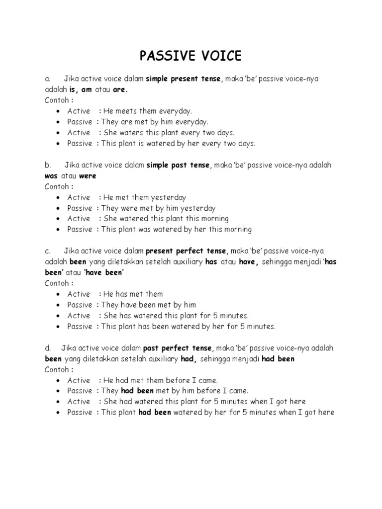 Contoh bentuk kalimat. Kalimat pasif dibentuk dari kalimat aktif dengan menjadikan subject dalam kalimat aktif sebagai object dalam kalimat pasif begitupun sebaliknya. Kalimat aktif positif menggunakan kata kerja verb 2 kalimat aktif negatif dan interogatif menggunakan kata bantu did dan kata kerja verb 1. Berikut ini contoh simple past tense in active voice and passive voice. Passive voice adalah kalimat yang subjeknya dikenai suatu aktivitas atau perbuatan.