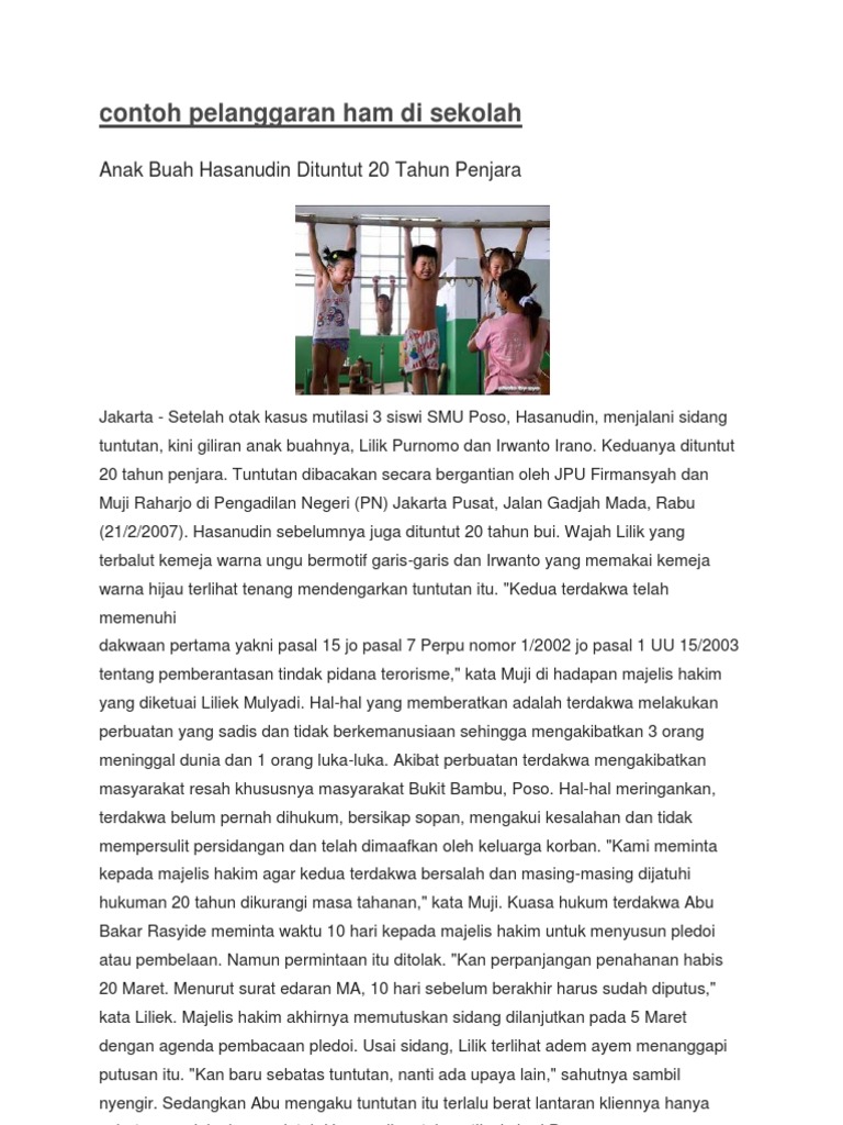 Contoh pelanggaran sila ke 2 di sekolah pancasila adalah dasar negara indonesia yang isinya merupakan lima aturan untuk seluruh warga indonesia. Maka dari itu dalam memilih kepala sekolah harus sangat berhati hati dan terdapat banyak sekali pertimbangan dan tidak hanya selalu berkutat pada tingkat pendidikan yang dimiliki oleh calon kepala sekolah tersebut. Kali ini saya akan menjelaskan tentang perkara yang sudah melekat pada diri manusia yaitu ham. Sebelum menginjak mengenai contoh pelanggaran di sekolah alangkah baiknya menelusuri dari apa itu ham dan bagaimana pasal pasalnya menurut pasal 1 angka 6 no. 15 contoh pelanggaran ham di indonesia sekolah komunitas keluarga dll. Kepala sekolah dapat dikenai pasal pelanggaran ham demikian pengamat pendidikan ade irawan dari koalisi pendidikan di jakarta senin 147menurutnya pihak koalisi pendidikan sudah mendirikan pos pos pengaduan di beberapa daerah untuk menampung semua keluhan masyarakat termasuk soal pungutan biaya sekolah anak.