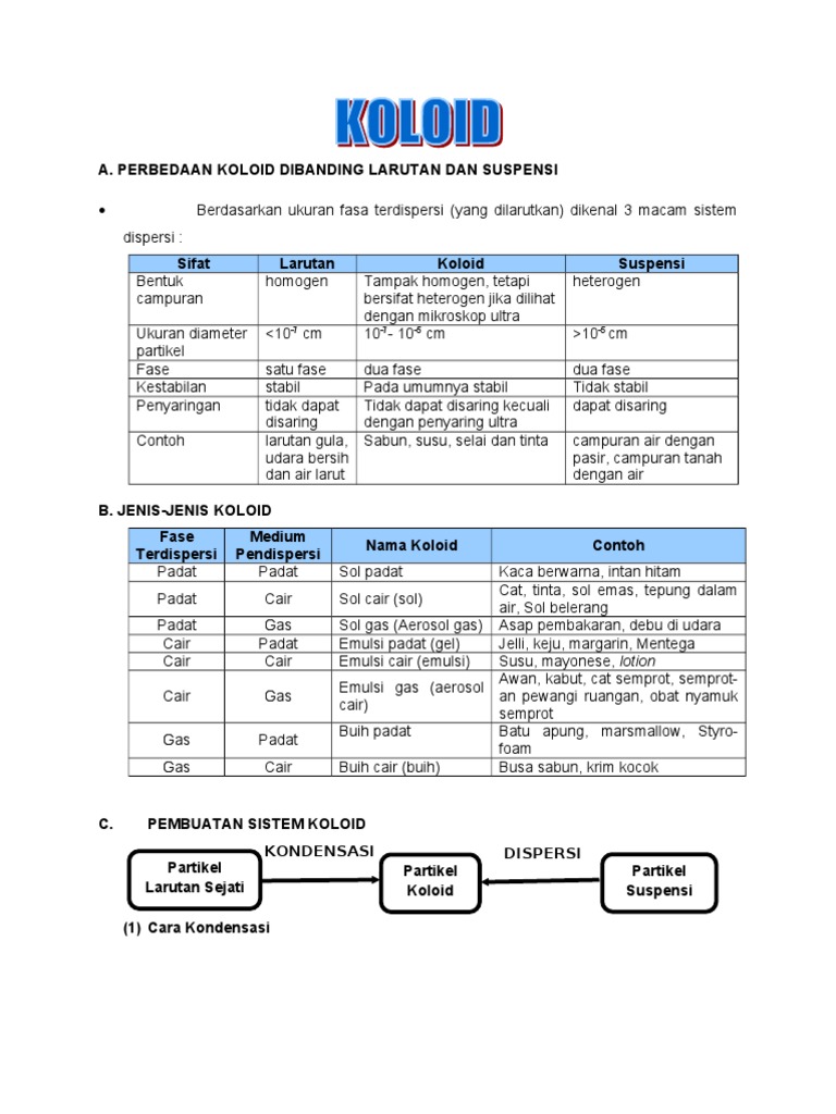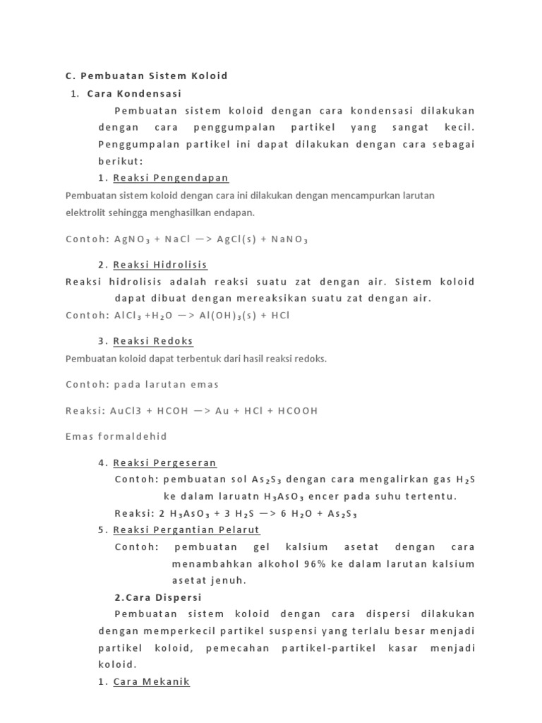 3h 2 sg as 2 o 3 aq as 2 s 3 s 3h 2 ol selain dengan cara cara di atas koloid ada yang terbentuk secara alamiah misalnya lumpur getah karet dan getah pohon nangka. Pembuatan koloid dengan cara kondensasi dan dispersi sistem contoh reaksi praktikum kimia sistem koloid dapat dibuat dengan pengelompokan agregasi partikel larutan sejati atau menghaluskan bahan dalam bentuk kasar kemudian diaduk dengan medium pendispersi. Kondensasi merupakan pembuatan partikel koloid dari larutan sejati. Reaksi hidrolisis reaksi dekomposisi rangkap reaksi pergantian perlarut dan reaksi redoks. Pembuatan koloid sol belerang. Pembuatan sol as 2 s 3 dengan mengalirkan gas h 2 s ke dalam larutan as 2 o 3.