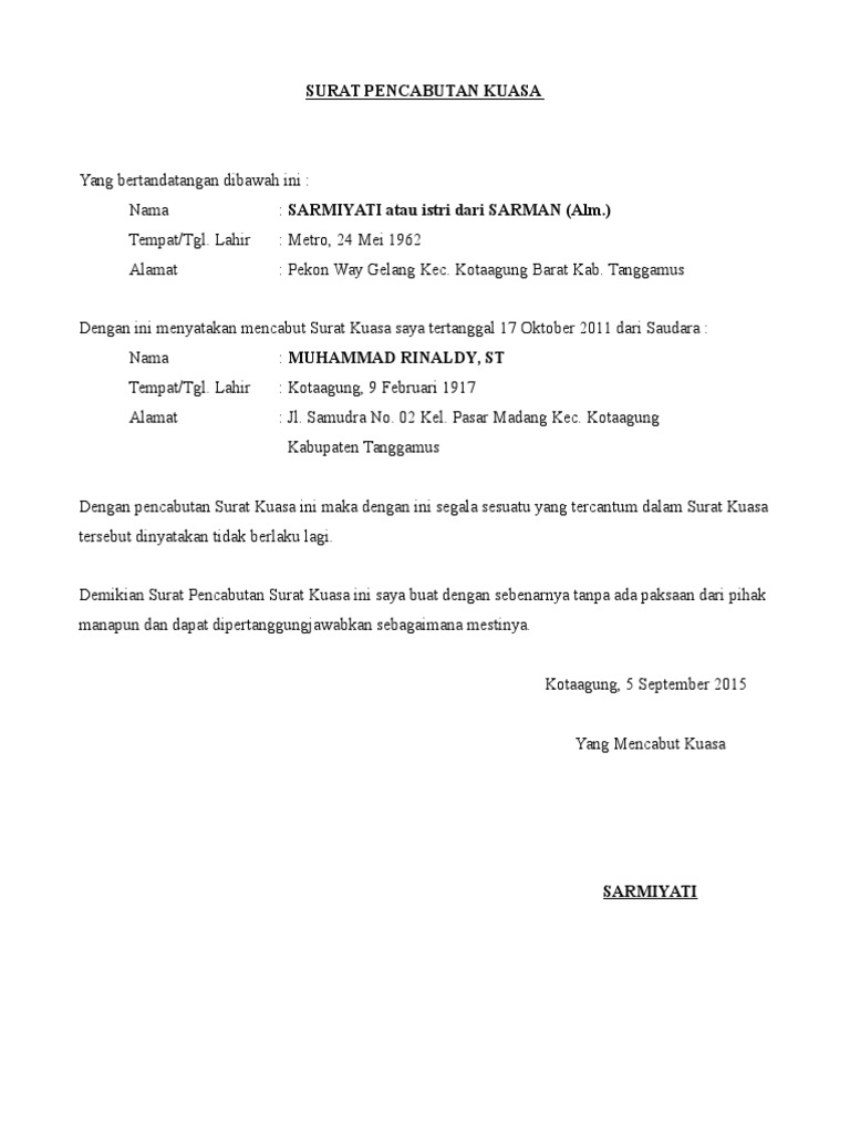 Contoh pencabutan surat kuasa. Saya yang bertanda tangan dibawah ini. Dengan dilakukannya pencabutan pemberian kuasa tersebut maka sejak tanggal dibuat dan ditandatanganinya surat ini saudara tidak lagi berkedudukan sebagai pihak yang dapat mewakili serta bertindak untuk dan atas nama. Contoh surat pencabutan kuasa yang benar reviewed by grobakz on wednesday may 6th 2015. Itulah mengenai contoh surat kuasa pengambilan dokumen untuk berbagai tujuan yang resmi. Surat pencabutan kuasa ini dibuat apabila kuasa atau wewenang yang kita berikan kepada orang yang kita tunjuk berakhir. Seseorang tak boleh melakukan semua kecuali izin yang ditanda tangankan di atas materai.
