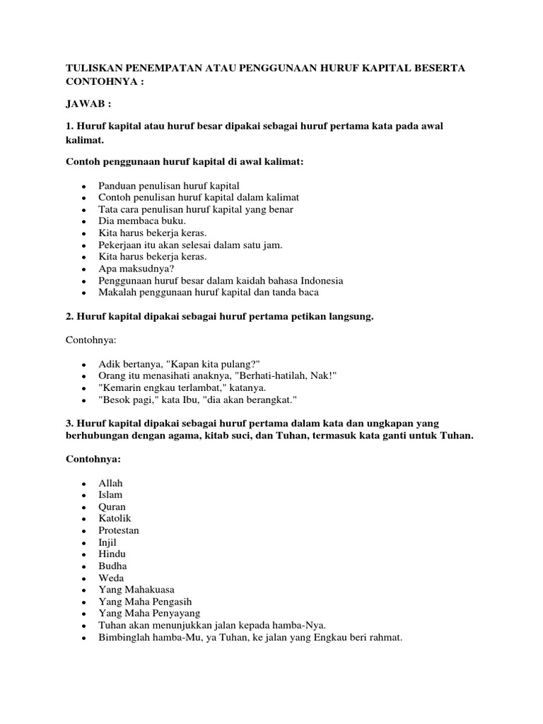 Contoh penggunaan huruf kapital yang benar dalam kalimat. Huruf kapital dipakai sebagai huruf pertama semua kata termasuk semua unsur kata ulang sempurna di dalam judul buku majalah surat kabar dan makalah kecuali kata tugas seperti di ke dari dan yang dan untuk yang tidak terletak pada posisi awal. Dia sedang menunjuk pada nama tarian tersebut. Berikut ini contoh soal yang berkaitan dengan penggunaan huruf kapital sekaligus pembahasannya. Saya sedang menghafal nama buah. Huruf kapital digunakan sebagai abjad pertama unsur nama gelar kehormatan keturunan keagamaan profesi serta nama jabatan dan kepangkatan yang dipakai dalam kalimat sapaan. Penggunaan huruf kapital yang sesuai dengan aturan terbaru adalah berdasarkan peraturan menteri pendidikan dan kebudayaan republik indonesia permendikbud nomor 50 tahun 2015 tentang pedoman umum ejaan bahasa indonesia.