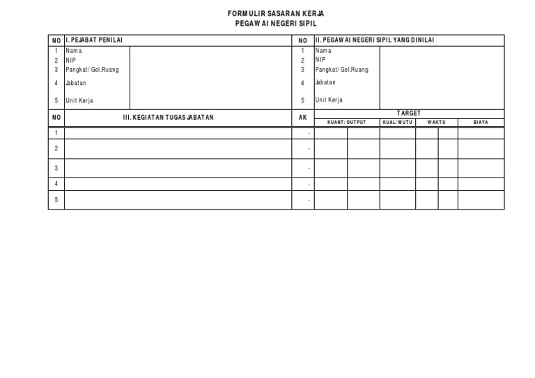 Contoh pengisian formulir sasaran kerja pegawai negeri sipil. 76 90 hasil kerja mempunya 1 atau 2 kesalahan kecil tidak ada kesalahan besar revisi dan pelayanan sesuai standar yg telah ditentukan dll. Pembuatan sasaran kerja pegawai skp wajib bagi setiap pegawai negeri sipil pns hal ini dijelaskan pada perka bkn nomor 1 tahun 2013 oleh karena itu melalui kesempatan ini kami mencoba memberikan contohnya yang mana pada pembahasan ini kami khususkan pada contoh sasaran kerja pegawai skp tenaga fungsional umum kesehatan. Aplikasi ini di share di excel indonesia user groupuntuk anda yang tertarik dengan aplikasi aplikasi pendidikan lainnya silahkan hubungi beliau dengan contact person yang ada pada menu profil pengarang dalam aplikasi ini. Oleh karena itu penilaian prestasi kerja secara sistemik menggabungkan antara penetapan sasaran kerja pegawai dengan penilaian proses pelaksanaan pekerjaan yang tercermin dalam perilaku kerja produktif hasilnya direkomendasikan untuk dasar pertimbangan tindakan pembinaan dan pengembangan karier pegawai negeri sipil yang dinilai. Penyusunan dan penilaian skp bagi pns yang mutasipindah sebagaimana yang dicontohkan pada perka bkn no. Demikian review singkat aplikasi berbasis ms.