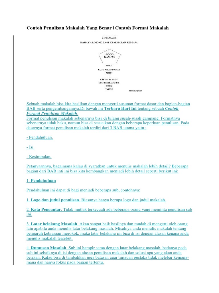 Contoh penulisan makalah yang benar. Contoh makalah yang baik dan benar di internet anda memang bisa menemukan contoh makalah serta penulisan yang baik dan benar. Contoh makalah halo sahabat semuanya kali ini saya akan menulis artikel bagaimana cara membuat makalah yang baik dan benar serta berbagai macam contoh makalah yang sering dibutuhkan kebanyakan orang. 13 tujuan dan manfaat. Sebenarnya ada banyak artikel tentang contoh makalah yang lengkap baik dan benar di internet tapi mudah mudahan tulisan kali ini bisa membantu anda dengan menyajikan secara lebih detail bagaimana mudahnya menyusun makalah secara baik dan benar dengan berpedoman pada kerangka makalah yang meskipun bisa berbeda beda antara institusi tempat dimana anda belajar yang satu dengan yang lainnya. Sistematika penulisan makalah menulis makalah adalah suatu hal yang tidak asing lagi untuk kamu para pelajar. Pemilihan kata juga dirasa penting agar pembaca mampu memahami dengan baik maksud yang ingin anda sampaikan dalam makalah.