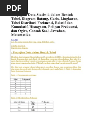 Pada penulisan kedua tentang statistika elementer ini penulis akan memberikan bahasan mengenai penyajian data statistik yang bertujuan untuk menjelaskan bagaimana cara memilih dan menentukan bentuk penyajian data pengamatan dalam tabel dan diagram statistikbeberapa orang terkadang masih bingung bagaimana menerapkan penyajian data statistik yang benar dan sesuai dengan jenis data pengamatannya. Misalnya berat badan menurut jenis kelamin jumlah pegawai menurut pendidikan jumlah penjualan menurut jenis barang dan daerah penjualan dll. Setiap peneliti harus dapat menyajikan data yang telah diperoleh baik yang diperoleh dengan metode wawancara. Pertama dalam bentuk tulisanteks sedang bagian kedua disajikan dalam bentuk gambargrafik. Penyajian data statistik dalam bentuk tabel diagram batang garis lingkaran tabel distribusi frekuensi relatif dan kumulatif histogram poligon frekuensi dan ogive contoh soal jawaban matematika ada dua cara penyajian data yang sering dilakukan yaitu. Penyajian data secara numerik terdiri dari beberapa macam macam yaitu antara lain.