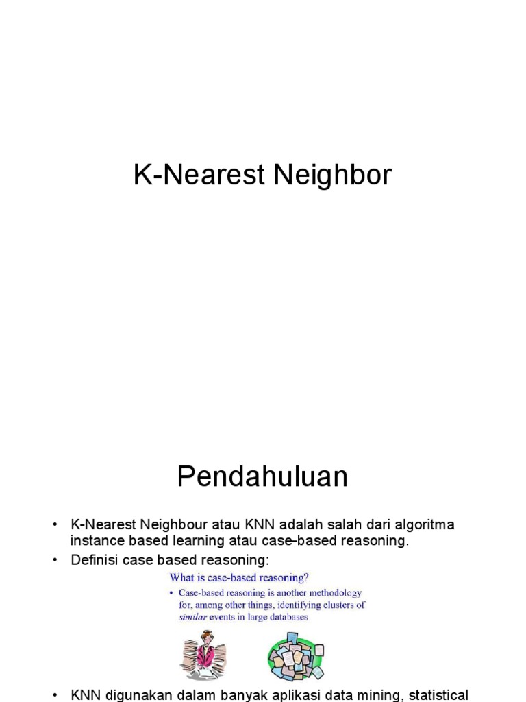 Contoh diatas hanyalah contoh yang sangat sederhana dalam menerapkan algoritma ini. Dengan k merupakan banyaknya tetangga terdekat. Termasuk dalam supervised learning dimana hasil query instance yang baru diklasifikasikan berdasarkan mayoritas kedekatan jarak dari kategori yang ada dalam k nn. Solusi dari kasus lama yang paling mirip dengan kasus. Algoritma k nearest neighbor k nn adalah sebuah metode klasifikasi terhadap sekumpulan data berdasarkan pembelajaran data yang sudah terklasifikasikan sebelumya. Output dari sistem cbr ini berupa solusi hasil diagnosis jenis penyakit pasien serta bagaimana penanganan medisnya.