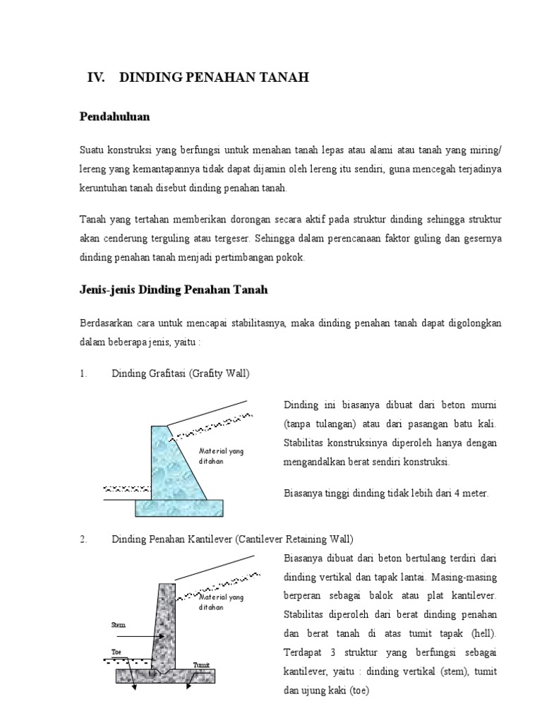 Tipe tipe dinding penahan tanah. Kontrol stabilitas dinding penahan tanah terhadap gaya pergeseran penggulingan serta terhadap keruntuhan kapasitas dukung tanah yang menggunakan persamaan vesic 1975. Postingan ini merupakan part 1 dari perancangan struktur dinding penahan tanah kantilever part ke 2 akan membahas tentang cara menghitung kebutuhan tulangan dinding penahan tanah tipe kantilever yang sudah dihitung disini. Dinding penahan tanah concrete cantilever dengan menggunakan program plaxis st udi kasus. Berat tanah timbunan diketahui sebesar 17 knm 3 dengan sudut gesek dalam i 35 o dan koefisien gesek antara beton dan tanah adalah p 05. 3dinding penahan tipe turap sheet pile jenis konstruksi dinding penahan tipe turap merupakan jenis konstruksi yang banyak digunakan untuk menahan tekanan tanah aktif lateral tanah pada timbunan maupun untuk membendung air coverdam.