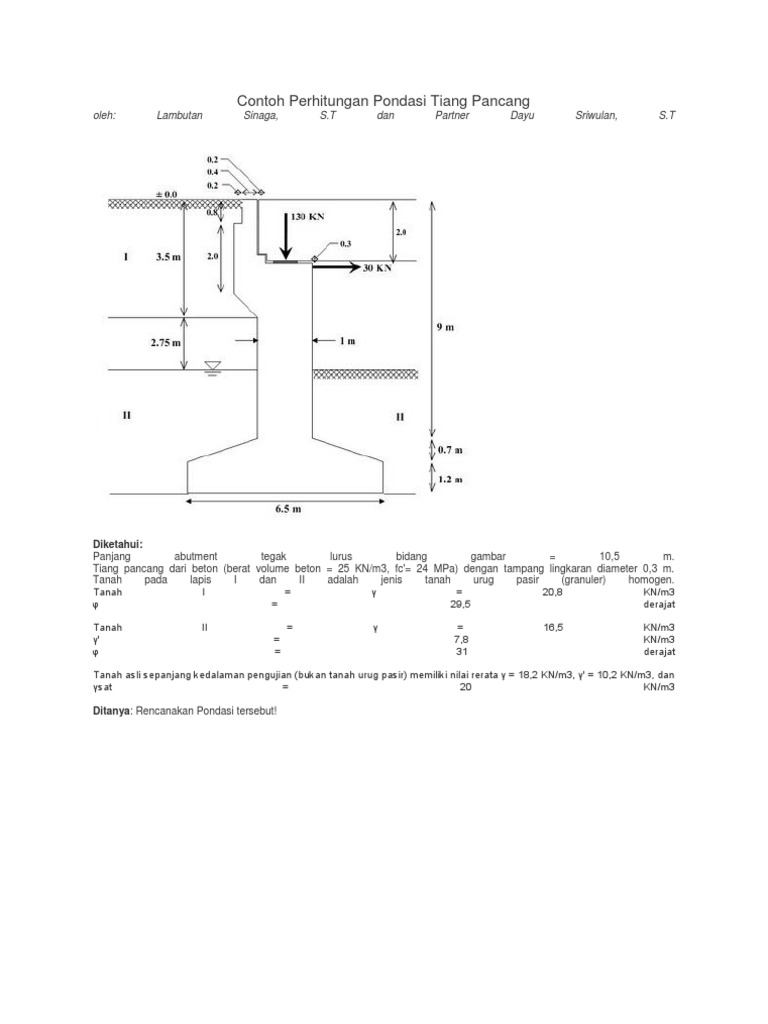Daya dukung berdasarkan kekuatan bahan paptbkastau. Pondasi dibagi berdasarkan kondisi tanahnya berikut adalah perbedaanya. Lambutan sinaga st dan partner dayu sriwulan st. Sebuah tiang pancang beton dengan panjang l 20 m. Contoh perhitungan beban normal maksimum n81407 ton. Contoh perhitungan beban normal maksimum n81407 ton.