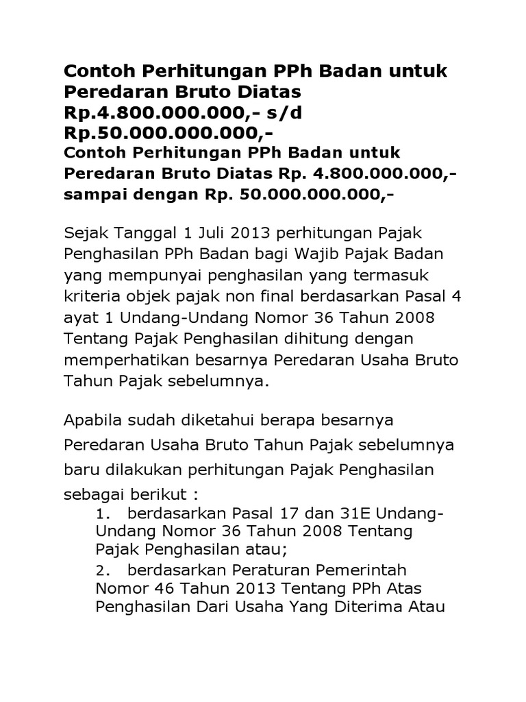 Total peredaran bruto pt a dalam tahun pajak 2015 sebesar rp450000000000. Peredaran bruto sampai dengan rp 4800000000. Namun demikian berdasarkan pasal 17 ayat 2a undang undang pph tarif tersebut sejak tahun pajak 2010 menjadi 25. Ilustrasi penghitungan pph pasal 17 ini sesuai dengan ilustrasi perhitungan yang tertera pada keterangan pph pasal 17 uu no. Untuk contoh contoh selanjutnya diasumsikan penerima penghasilan yang dipotong pph pasal 21 sudah memiliki npwp kecuali disebut lain dalam contoh tersebut. Untuk menghitung besarnya angsuran pph pasal 25 tahun berjalan.