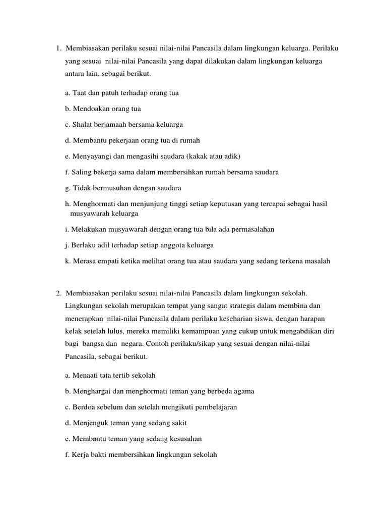 Contoh sikap dan perilaku jujur di lingkungan sekolah 1. Membayar jumlah uang sesuai dengan yang dibeli saat jajan 3. Contoh perilaku yang mencerminkan nilai nilai pancasila. B melaksanakan acara pernikahan acara selamatan anak dan upacara kematian. Lingkungan sekolah merupakan tempat yang sangat strategis dalam membina dan menerapkan nilai nilai pancasila dalam perilaku keseharian siswa dengan harapan kelak setelah lulus memiliki kemampuan yang cukup untuk mengabdikan diri bagi bangsa dan negara. Mengembalikan kelebihan uang kembalian saat jajan 4.