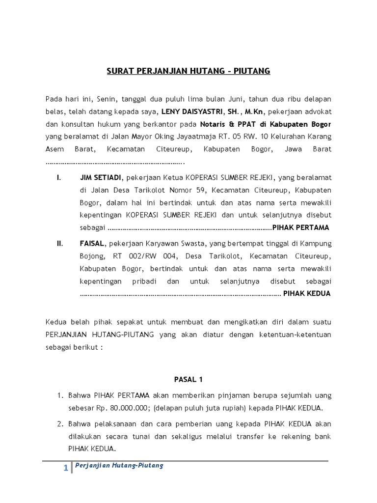 Contoh surat perjanjian utang surat perjanjian utang piutang. 339 cibinong bogor dengan dihadiri oleh saksi saksi yang saya notaris kenal dan akan disebutkan pada bagian akhir akta ini. Perjanjian pun bisa dibuat dengan cara lisan dan cara tertulis. Contoh surat perjanjian hutang piutang 3. Contoh surat perjanjian hutang piutang surat perjanjian adalah surat yg berisikan suatu kesepakatan bersama yg mengikat antara pihak pihak tertentu utk melakukan sebuah tindakan atau perbuatan hukum yg telah disepakati secara bersama. 15 contoh surat perjanjian hutang piutang yang baik dan benar dalam berbagai kasus penggunaan surat perjanjian memang sangat dibutuhkan.