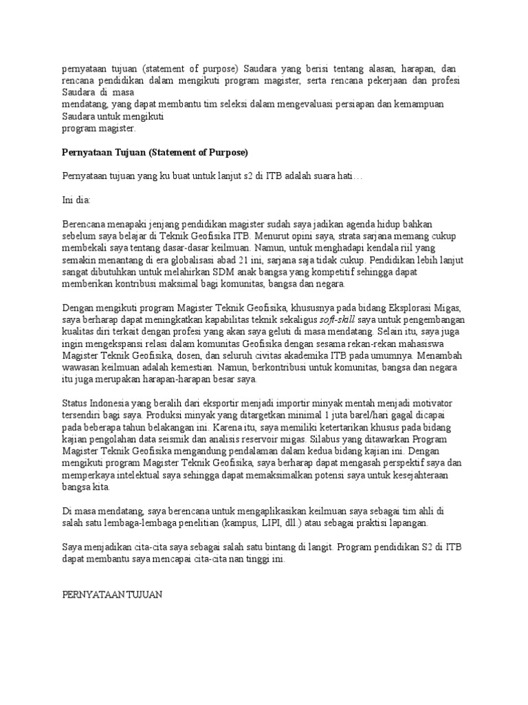 Jika tidak ada intruksi yang jelas cari referensi mengenai penulisan surat pernyataan tujuan dengan latarbelakang yang sama misal untuk s2 bisnis maka cari referensi untuk s2 bisnis. Contoh pernyataan tujuan statement of purpose pascasarjana itb salam readers. Di dalam raditya muhammad. Artikel ini bisa menjadi referensi anda ketika anda bingung memilih format yang tepat untuk surat. Berencana menapaki jenjang pendidikan magister sudah saya jadikan agenda hidup bahkan sebelum saya belajar di teknik geofisika itb. Sebelumnya perhatikan intruksi yang diberikan oleh setiap panitia penerimaan dari pihak kampus yang dituju.