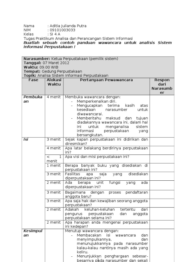 Topik penelitian atau daftar pertanyaan dapat mempengaruhi kelancaran dan hasil wawancara. Pastikan sesuatunya dapat dibicarakan. Tips umum ketika menjawab pertanyaan wawancara kerja. Contoh isi wawancara skripsi kualitatif jenis penelitian studi kasus. Posting pada bahasa indonesia ditag 10 pengertian dokumen menurut para ahli 5 tujuan perusahaan melakukan wawancara kerja apa syarat menjadi narasumber. Contoh instrumen observasi dan transkrip wawancara skripsi dan tesis dalam melakukan penelitian skripsi atau tesis maka dibutuhkan yang namanya pedoman penelitian atau instrumen observasi yang nantinya adalah menjadi pegangan kita dalam melakukan penelitian sehingga ketika kita akan terkontrol dan tidak keluar jalur dan hasil penelitian pun semakin bagus pada postingan kali ini saya ingin.