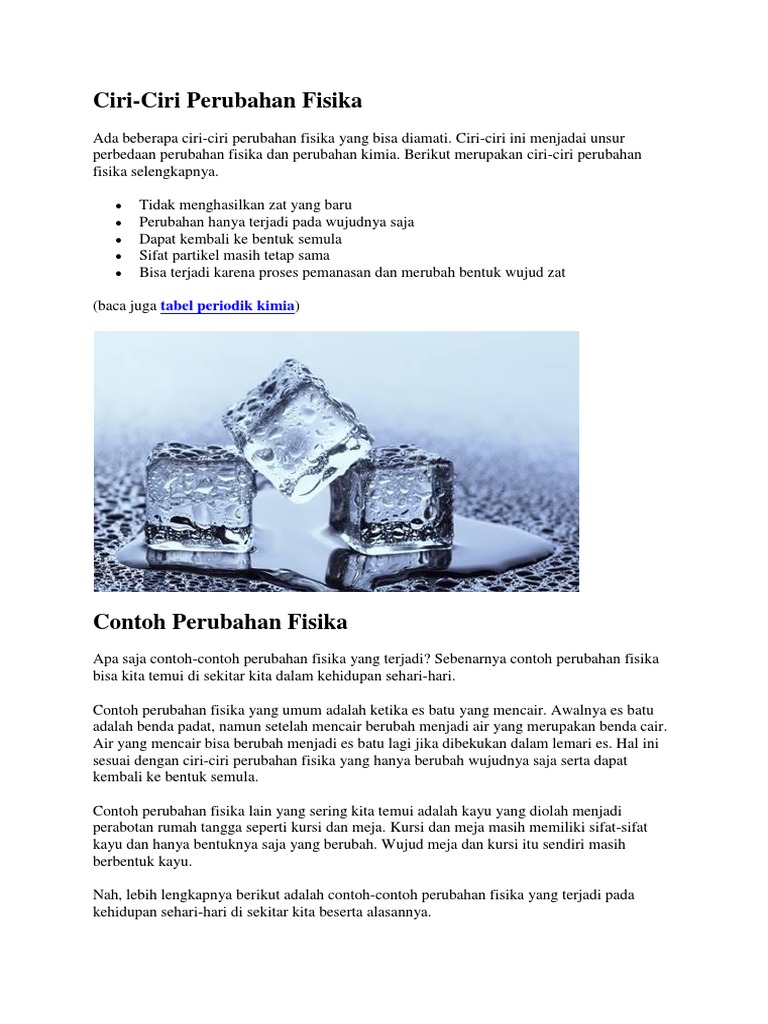 Contoh perubahan fisika dan kimia beserta alasannya. Perubahan kimia yaitu perubahan suatu zat yang terjadi karena reaksi kimia hingga menimbulkan zat baru. Perubahan perubahan kimia ini sifatnya ireversibel yang artinya tidak bisa kembali ke wujud semula. Perubahan fisika pengertian ciri 10 contoh dan gambar untuk pembahasan kali ini kami akan mengulas mengenai perubahan fisika yang dimana dalam hal ini meliputi pengertian ciri 10 contoh pos pos terbaru. Perubahan kimia dan fisika berita informasi 21 kali ini akan memberikan informasi tetang ilmu pengetahuan alam bagi yang sedang mencari artikel pelajaran matematika lihat postingan sebelumnya yang berjudul rumus matematika smp lengkap rumus matematika sma lengkap atau tentang pengetahuan daftar negara negara asia timur dan ibu kotanya dan silahkan untuk artikel sekarang simak baik baik. 43 76 seputarilmucom perubahan yang terjadi tergantung pada sifat sifatnya. Untuk itu mari simak baik baik ulasan dibawah berikut.