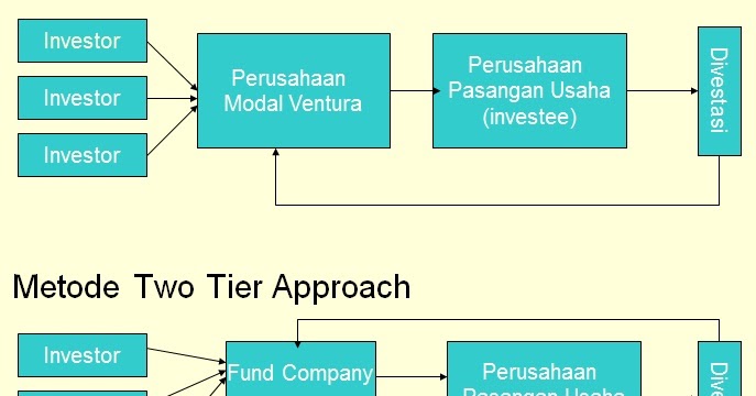 Two tier approach pengelolaan modal ventura yang melibatkan dua badan usaha terpisah dimana yang satu sebagai perusahaan penyedia dana fund company dan yang lain sebagai perusahaan pengelola management company yang melakukan pengelolaan fund company. Adalah perusahaan modal ventura yang berani melakukan investasi di mana investasi tersebut mengandung suatu resiko tinggi.