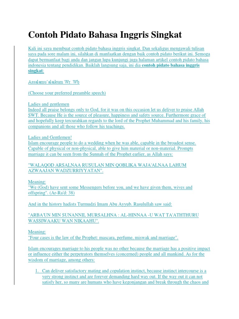 Contoh pidato bahasa inggris singkat tentang islam. Demikianlah contoh pidato bahasa inggris yang bisa kami tampilkan untuk sementara ini. Dalam belajar bahasa inggris menguasai speaking merupakan salah satu hal yang harus dilakukan. Contoh pidato tentang cinta tanah air naskah pidato. Belajar untuk menguasai speaking dapat menggunakan berbagai metode dan cara salah satunya adalah dengan melakukan pidatokarena bahasa inggris sudah menjadi salah satu hal penting dalam pendidikan ada baiknya jika belajar menguasai bahasa inggris sudah dilakukan sejak dini. Manusia dilahirkan dan datang ke dunia ini dalam keadaan polos telanjang buta ilmu pengetahuan walaupun ia dibekali dengan kekuatan dan pancaindera yang dapat menyiapkannya untuk mengetahui dan belajar. Contoh pidato bahasa inggris singkat tentang islam.
