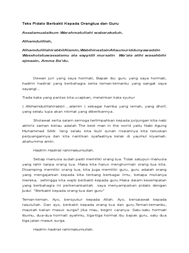 Tampak kecintaan dan kemulyaan bagi mereka. Berbakti dan berbuat baik kepada orang tua mengasihi menyayangi mendoakan taat hormat dan patuh terhadap apa yang mereka perintahkan termasuk melakukan hal hal yang mereka sukai adalah kewajiban yang harus dilakukan oleh setiap anak kepada orang tuanya. Ayo bersalawat kepada rasulullah. Betapa penting berbakti kepada orang tua. Maka kita harus menghormati orang tua kita. Maka dalam kesempatan yang berbahagia ini perkenankanlah saya menyampaikan pidato dengan judul berbakti kepada orang tua dan guru.