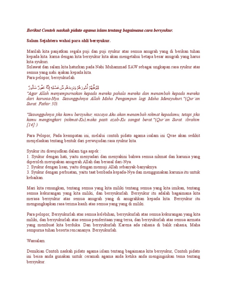Kami juga memberikan cara membuat teks pidato yang baik dan benar. Assalamualaikum wr wb bapak bapakibu ibu beserta rekan rekan yang saya hormati pertama tama marilah kita panjatkan puji dan syukur kepada allah swt yang telah memberikan rahmat dan hidayah nya kepada kita semua sehingga kita dapat berkumpul ditempat yang insya allah penuh barokah ini amiiin. Pidato agama islam singkat hendaklah mengandung unsur islami menjelaskan dan mengajarkan ajaran ajaran agama islam dan memberi garis tegas antara hak dengan bathil. Contoh ceramah singkat ceramah atau pidato keagamaan adalah ceramah yang dilakukan oleh ahli agama atau biasa disebut ustad yang notabennya mempunyai ilmu agama lebih dan dibagikan kepada orang lain dengan tujuan agar banyak yang paham dan mengerti ilmu agama tersebut. Di hari peringatan kemerdekaan atau hari hari mengenang para pahlawan biasanya pidato tentang cinta tanah air disampaikan di acar acara. Menumbuhkan sifat sabar tentu bukanlah hal yang mudah mengingat pentingnya kesabaran bagi seorang muslim melalui contoh pidato agama islam tentang kesabaran akan kita bahas tuntang cara menumbuhkembangkan sifat sabar di dalam diri kita.