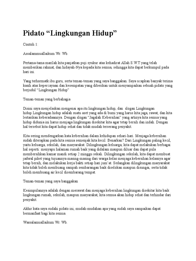 Contoh pidato tentang lingkungan hidup. Demikianlah contoh pidato lingkungan hidup kali ini semoga contoh ini bisa menjadi referensi pembaca dalam membuat naskahteks pidato sendiri yang baik dan benar. Tak banyak yang tahu agar naskah pidato singkat tersebut pada akhirnya tidak membosankan maka harus disampaikan sesuatu yang menarik dan membuat orang dengan senang hati akan mendengarkan. Dan teman teman kelas x 3 yang saya cintai. Silahkan mencermati contoh pidato tentang lingkungan berikut ini. Puji syukur kita panjatkan kehadirat tuhan yang maha esa karena berkat rahmat dan karunia nya jua lah kita dapat berkumpul dalam keadaan sehat walafiat tanpa kurang apapun. Contoh pidato bahasa inggris.