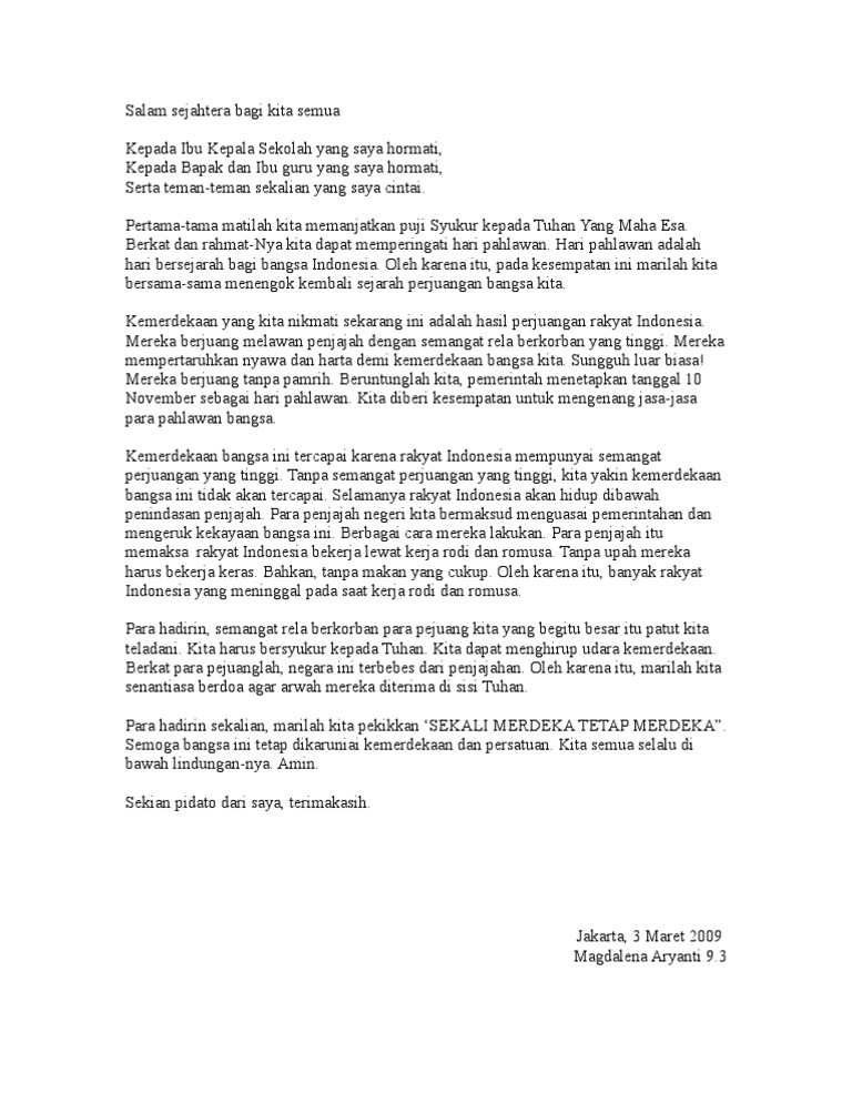 Pada kesempatan yang baik ini marilah kita bersyukur kepada allah swt atas limpahan rahmat nimat dan taufiq serta hidayah nya yang telah diberikan kepada kita sehingga pada kesempatan hari ini kita dapat berkumpul dan berjumpa pada acara peringatan hari pahlawan 10 november. Hari kamis tanggal 7 mei 2009 jam 2. Semoga contoh naskah pidato kemerdekaan di atas bisa menjadi contoh bagi sobat sekalian dalam membuat pidato tentang pahlawan kemerdekaan yang saya yakin jauh lebih bagus dari pidato di atas. Contoh pidato hari pahlawan hari pahlawan adalah peristiwa sejarah perang antar tentara indonesia dengan belanda yang terjadi pada tanggal 10 november 1945 di kota surabaya. Download pidato hari pahlawan 2017 pidato mk upacara hari pahlawan. Contoh naskah pidato singkat hari pahlawan assalamualaikum wr.