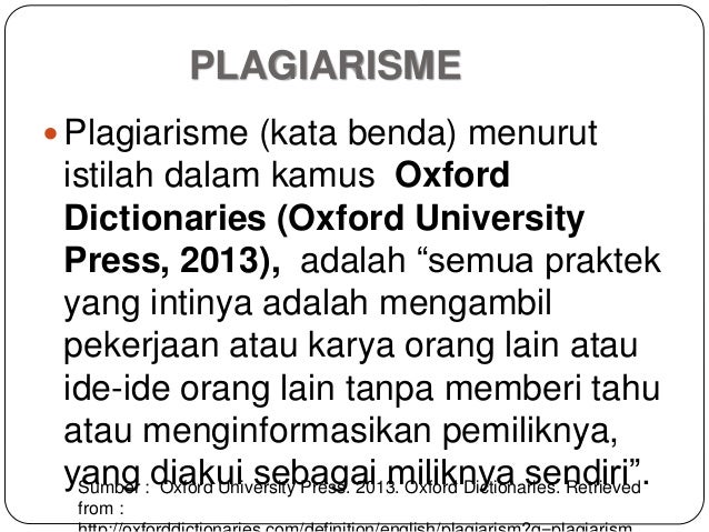Definisi plagiarisme sangat banyak salah satu contohnya menurut kbbi kamus besar bahasa indonesia plagiat merupakan tindakan mengambil karangan pendapat dsb orang lain lalu menyiarkannya sebagai karangan pendapat dsb sendiri. Plagiat total berarti lebih dari 70 isi karya tulis ilmiahnya merupakan plagiat dari karya orang lain. Dengan abstrak semua hal hal penting sudah ditentukan di awal sehingga menghindari penulisan karya ilmiah yang keluar dari pokok pembahasan yang sudah ditetapkan sebelumnya pada abstrak. Mencuri dan menyebarkan ide tulisan data karya atas nama diri menggunakan hasil orang lain tanpa. 24 sistematika penulisan karya ilmiah.