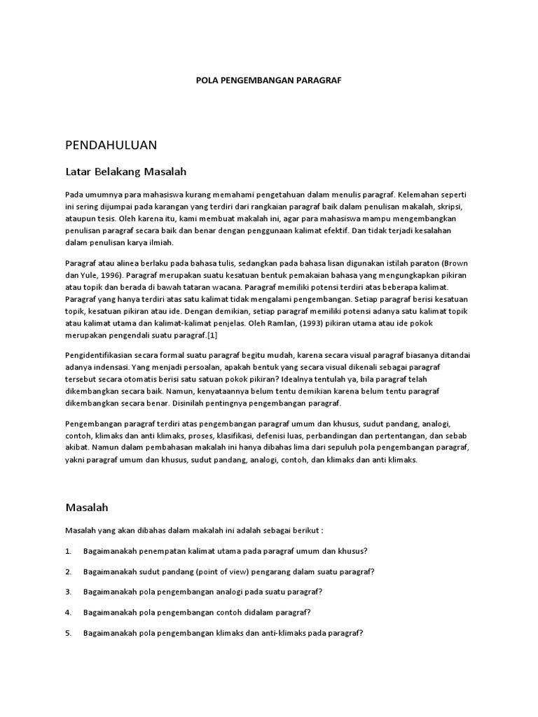 Contoh pola pengembangan paragraf. Contoh pola analisis korupsi kolusi dan nepotisme kkn terus menjamur di indonesia. Pola pola tersebut nantinya akan membentuk jenis jenis paragraf berdasarkan pola pengembangannya. Pola analisis adalah pola pengembangan paragraf yang biasa digunakan untuk menyusun paragraf eksposisi atau argumentasi. Contoh pola pengembangan paragraf klimaks dan anti klimaks. Pola analisis digunakan untuk menjelaskan suatu hal atau gagasan yang sifatnya umum ke dalam perincian perincian yang logis. Pertama pola spesial atau urutan ruang misalnya gambaran dari depan ke belakang dari luar kedalam dan sebagainya.