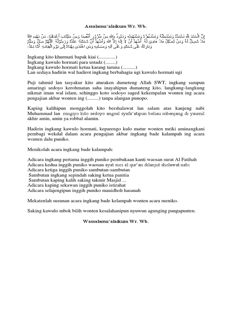 Halo wadhoooh bagus amat pidatonya thanks buat yang udah buatin. Contoh teks naskah untuk mc atau pembawa acara pengajian dalam bahasa jawa materi ini saya posting sebagai pengalaman saya untuk mempersiapkan materi ketika menjadi mc atau pembawa acara dalam pengajian dalam rangka menyambut bulan suci romadhan. 2contoh teks pranatacara bahasa jawa acara pengajian assalaamualaikum warahmatullaahi wabarakaatuhu innalhamdalillaah nahmaduhu wanastainuhu wanastaghfirruhu wanauudzubillahi min syuruuri anfusina wa min sayyiati amaalina may yahdihillahu fala mudzillalah wa may yudlill fala haadiyalah asyhadu an laailaaha illallaah wahdahu laa syariikalahu wa asyhadu anna muhammadan.