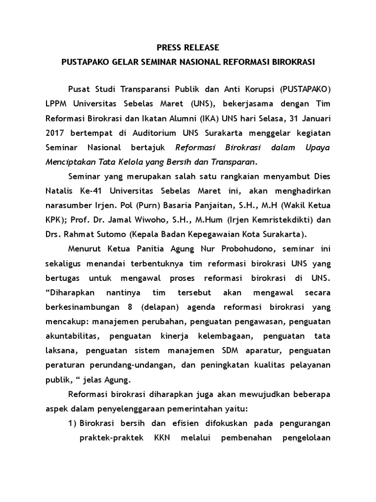 Press release siaran pers atau rilis adalah informasi biasanya berupa naskah berita yang dibuat oleh public relations pr atau hubungan masyarakat humas suatu organisasi perusahaan atau instansi yang disampaikan kepada media massa untuk dipublikasikan dalam media massa tersebut. Surabaya 9 mei 2014 dua orang. Gerakan mahasiswa yang perduli terhadap lingkungan. Melihat kondisi mahasiswa dan pekerja kantoran yang aktif dalam kegiatan sehari harinya. Press release green act universitas paramadina. Jakarta 10 mei 2012 dalam rangka memperingati hardiknas hari pendidikan nasional mahasiswa public relations pr program studi ilmu komunikasi universitas paramadina akan menyelenggarakan kegiatan social responsibility yang ditujukan kepada mahasiswa paramadina dosen staff universitas.