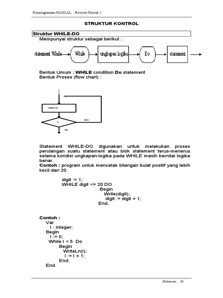 Contoh program pascal perulangan while do. Dalam for do nilai awal perulangan dan nilai akhir sudah harus ditulis di awal kode program. Perulangan for while dan do while pada bahasa c perulangan atau biasa disebut juga looping sangat sering digunakan dalam bahasa program dengan adanya ini ketika kita ingin membuat banyak kondisi maka gunakanlah perulangan agar kode menjadi lebih praktis dan mudahterdapat tiga perulangan yaitu perulangan for perulangan while dan perulangan do while. While perulangan while digunakan untuk kondisi perulangan dimana banyaknya perulangan tidak dapat dipastikan pada saat penulisan program. Contoh program while do looping pascal. Tujuan perulangan disini adalah untuk mengulang statement atau blok statement berulang kali sesuai sejumlah yang ditentukan pemakai. Konsep dasar perulangan while do dalam pascal.