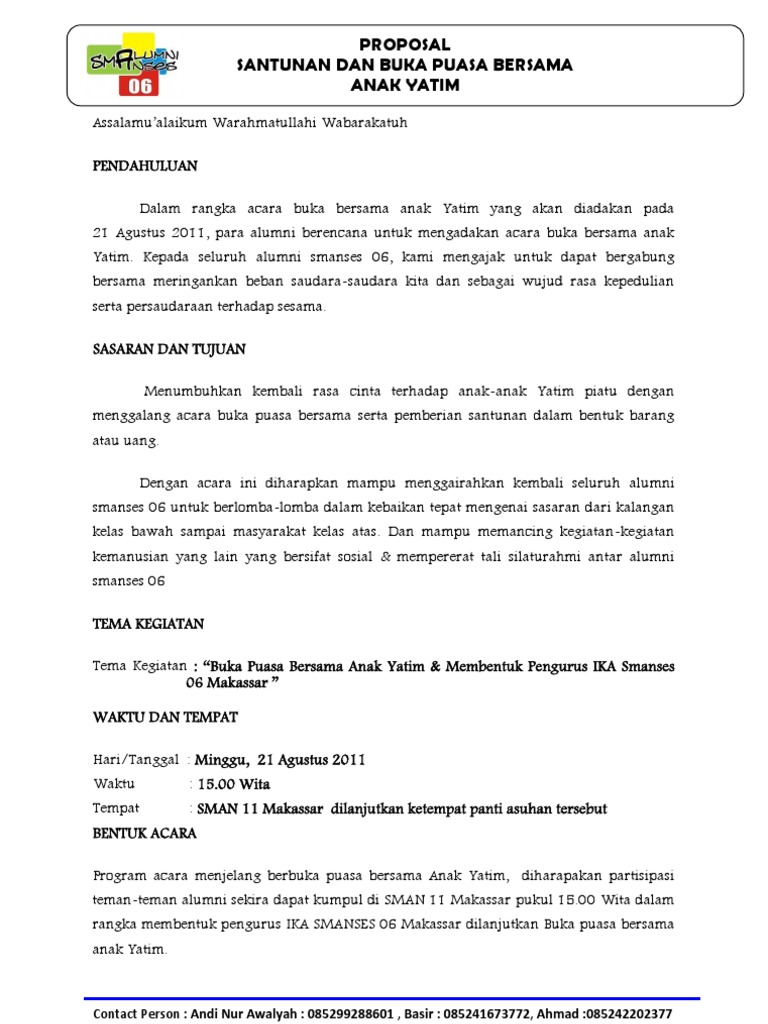 Contoh proposal kegiatan buka bersama smk bunda kandung. Senin 11 februari 2013. Ow iya sebelumnya tentunya juga ada halaman judul halaman pengesahan kata pengantar dan daftar isi ya. Puji dan syukur kita panjatkan kepada allah swt yang telah memberikan kenikmatan serta kebaikan kepada kita semua. Contoh surat undangan alumni hal ini harus dilakukan supaya ada dan teman anda yang dulu bisa melakukan reuni sesama alumni sehingga hubungan anda sebelumnya menjauh dan akan mendekat lagi dengan adanya udangan alumni tersebut dan ini memang kami sampaikan untuk format surat undangan alumni kepada anda semua melalui blog ini sehingga anda yang ingin menggelar acara kumpul kumpul bersama. Contoh proposal buka puasa bersama oke langsung saja ini dia contoh proposalnya.