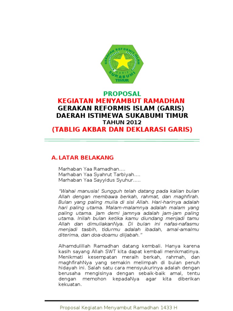 Hanya di ramadhan pula terdapat malam yang lebih baik dari seribu bulan yaitu malam lailatul qadr. Ramadhan adalah bulan diturunkannya al quran kalam ilahi yang berfungsi sebagai pedoman dan petunjuk hidup bagi orang orang yang menginginkan keselamatan dan kebahagiaan di dunia dan akhirat. Proposal pondok ramadhan 2013pdf. Berguna sebagi itibar pengambilan pelajaran dan tauladan dari contoh contoh di masa lampau sehingga memberikan azas manfaat secara lebih khusus demi keberlangsungan hidup umat. Anda di halaman 1 dari 9. Contoh proposal ramadhan halo teman teman yang berbahagia semua saya ucapkan marhaban ya ramadhan alhamdulillah telah datang kembali bulan ramadhan tercinta yaitu bulan istimewa bagi umat islam di seluruh dunia termasuk juga negara indonesia yang kita banggakan ini ramadhan merupakan waktu dimana kita memperbanyak amal ibadah untuk mendapatkan pahala yang berlipat lipat dari allah swt.