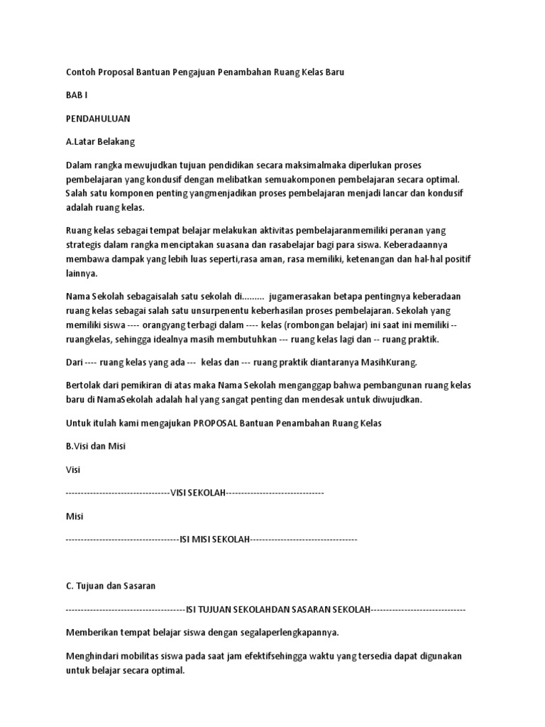 Kepada direktur pembinaan pendidikan anak usia dini direktorat jenderal pendidikan anak usia dini nonformal dan informal kemedikbud. Pelaksanaan pembangunan ruang kelas baru akan dimulai setelah dana bantuan imbal swadaya pembangunan ruang kelas baru smp islam alfath dari departemen pendidikan dasar dan menengah pusat jakarta tahun anggaran 20102011 diterima dan waktu. Proposal permohonan bantuan ruang kelas baru. Berikut ini contoh proposal permohonan bantuan dana untuk pembangunan ruang kelas baru proposal permohonan bantuan dana ruang kelas baru rkb 2018 proposalpermohonan bantuan ruang kelas baru r k b tahun 2018. Direktur jenderal pendidikan islam.