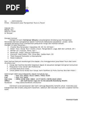 Itulah mengenai contoh surat penawaran paket tour format resmi. Academiaedu is a platform for academics to share research papers. Contoh penawaran paket wisata penawaran paket surat penawaran wisata domestik wisata ke luar negeri wisata religi. Sambutan bali khaya tour salam hormat merupakan kegembiraan bagi kami berkesempatan mengajukan proposal atau penawaran pengelolaan dan penyelenggaraan kegiatan paket wisata tour packages kepada para pembaca proposal ini yang ingin melakukan tujuan wisata ke pulau bali untuk mendapatkan suasana yang berbeda dari kehidupan kegiatan rutinitas sehari hari anda. Adapun draftar harga paket wisata tergantung jauh dan dekatnya tujuan wisata. Berikut kami berikan salah satu contoh proposal penawaran paket wisata atau tour dalam bahasa inggris.