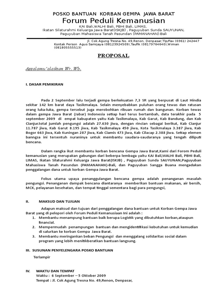 Contoh proposal penggalangan dana bencana alam. Kota cimahi secara geografis termasuk dalam kawasan bandung utara kbu yang meliputi sebagian wilayah kabupaten bandung kota bandung kota cimahi dan kabupaten bandung barat dengan di sebelah utara dan timur dibatasi oleh punggung topografi yang menghubungkan puncak gunung burangrang masigit gedongan sunda tangkubanparahu dan manglayang. Inayah dan hidayah nya kami dapat menyusun proposal penggalangan dana korban banjir yang melanda desa tedunan kecwedung. Contoh proposal bencana alam tanah longsor. Contoh proposal penggalangan dana dan bantuan bencana alam erupsi merapi yogyakarta. Limbangan kabupaten garut 2008 kepada yth. Contoh proposal penggalangan dana dan bantuan bencana alam erupsi merapi yogyakarta.