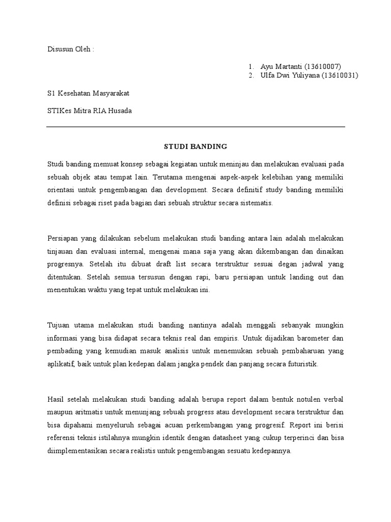Kegiatan ini menjadi modal yang sangat berharga bagi guru guru sebagai peserta study visit dapat melihat langsung secara dekat bagaimana sekolah sekolah berkwalitas di yokyakarta dapat mengembangkan pendidikannya hal ini menjadi inspirasi tersendiri bagi kami untuk lebih meningkatkan pelayanan pendidikan khususnya di sd inpres kuipons dengan harapan pencapaian hasil yang maksimal. Proposal studi banding ke mtsn babat proposal study banding mts al mukarromin. Demikianlah proposal studi banding ke iain antasari banjarmasin dan harian umum banjarmasin post group. Kegiatan studi banding ini insya allah akan diikuti oleh guru dan karyawantata usaha sma negeri 85 jakarta sebanyak 54 orang daftar nama peserta terlampir. Contoh surat kunjungan. Ini kami susun sebagai suatu bentuk kegiatan untuk mempererat tali silaturrahmi serta mengembangkan ilmu pengetahuan mahasiswa stai darul ulum kandangan dukungan dan partisipasi dari semua pihak sangat kami harapkan demi kelancaran dan kesuksesan kegiatan ini.