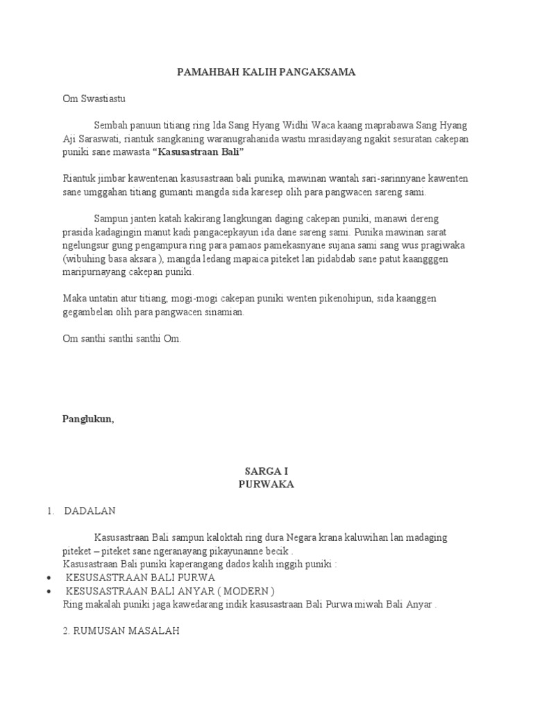 Posting lebih baru posting lama beranda. Kasusastran bali purwa wenten sane mawangun gancaran wenten sane mawangun puisi. Contoh puisi bali purwa bali anyar karangan saya sendiri dengan bertemakan hari suci tumpek landep. Contoh puisi bali purwa sekar rare sekar alit sekar madya sekar agung contoh prosa bali anyar 1. Hanya anggota dari blog ini yang dapat mengirim komentar. Kasusastran bali miwah jawa kuna manut aab kaepah dados kalih minakadi.