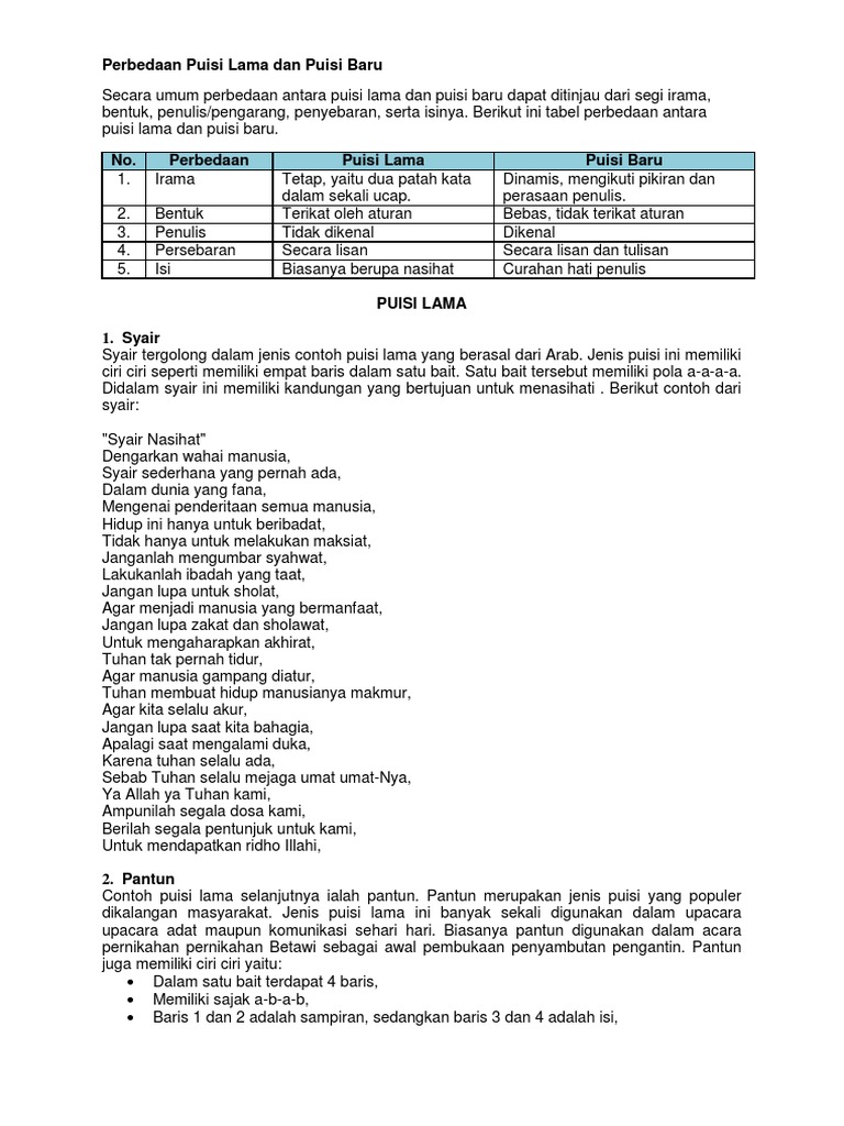 Contoh puisi lama dan baru. Contoh puisi baru. Puisi baru ini adalah puisi yang bebas dan tidak terikat dengan aturan aturan seperti halnya puisi lama. Aturan aturan dalam puisi lama adalah. Puisi baru bentuknya lebih bebas dibanding puisi lama bebas dalam segi jumlah suku kata jumlah baris maupun sajaknya. Puisi lama adalah puisi yang terikat oleh aturan aturan. Pengertian puisi lama menurut kbbi kamus besar bahasa indonesia adalah puisi yang belum dipengaruhi oleh puisi barat seperti pantun gurindam syair mantra dan bidal.