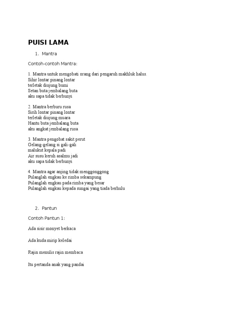 Mantra biasanya digunakan atau diucapkan pada waktu dan tempat tertentu yang memiliki tujuan untuk menimbulkan suatu kemampuan tertentu bagi orang yang menggunakan atau mengucapkan mantra tersebut. Mantra juga termasuk dalam puisi lamatua yang pada masyarakat melayu bukan dianggap sebagai sebuah karya sastra tetapi lebih berhubungan dengan adat istiadat dan kepercayaan. Contoh puisi lama puisi lama memiliki jenis yang bermacam macam pada pembahasan kali ini kami akan memberikan contoh dari masing. Puisi merupakan salah satu karya sastra yang berisi pemikiran dan perasaan penulisnya. Mantra juga termasuk dalam puisi lamatua yang pada masyarakat melayu bukan dianggap sebagai sebuah karya sastra melainkan lebih berhubungan dengan adat istiadat dan kepercayaan. Puisi lama yang dianggap memiliki kekuatan gaib ini dapat dikatakan sebagai jenis puisi lama yang pertama kali berkembang.